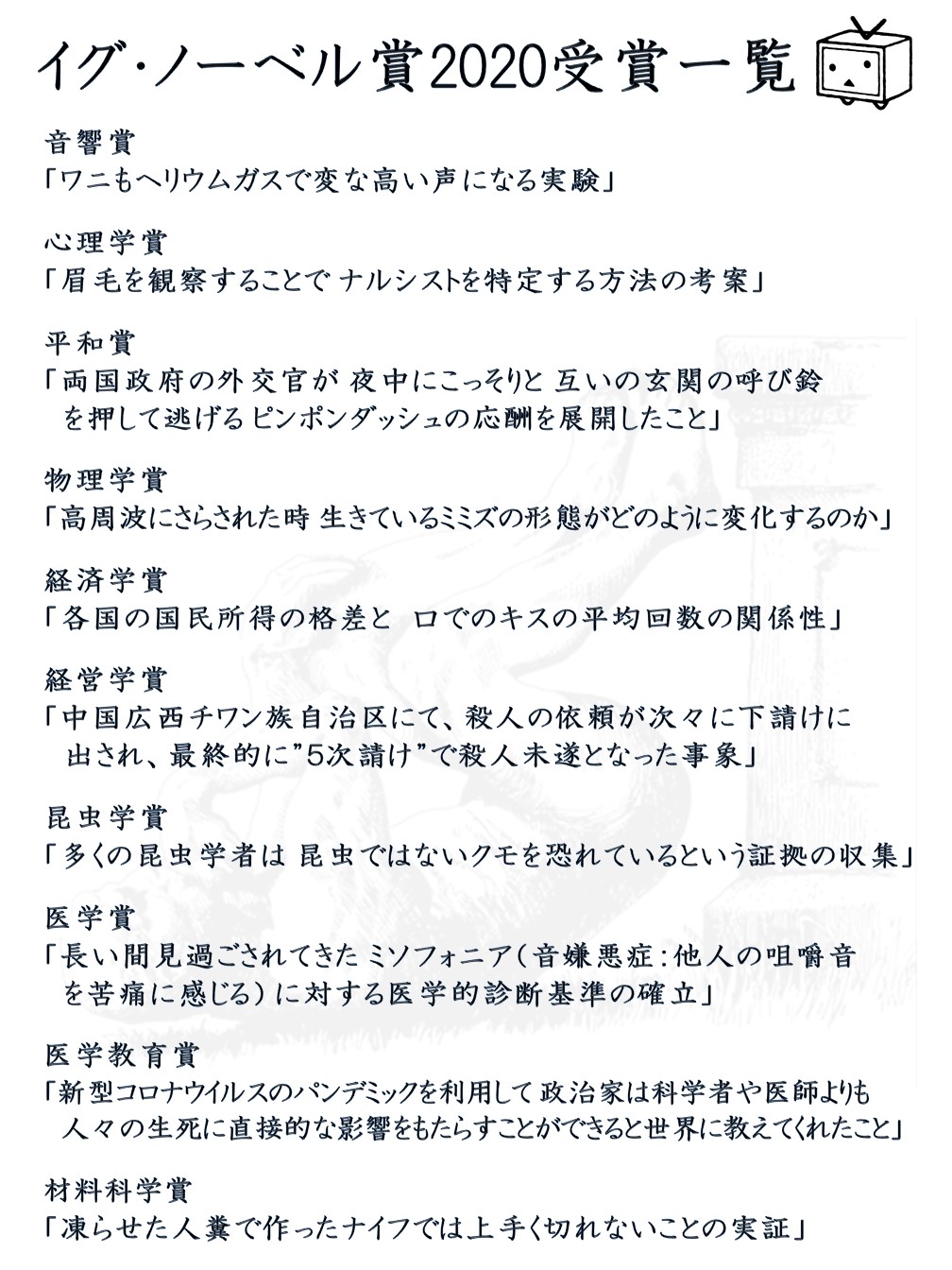 ニコニコニュース On Twitter イグ ノーベル賞2020 受賞一覧はこちら Https T Co Srntflbse5 平和賞に 外交官同士によるピンポンダッシュの応酬 医学教育賞に 新型コロナ対応の各国首脳 など 今夕18時からは日本科学未来館の科学コミュニケーターが今年の